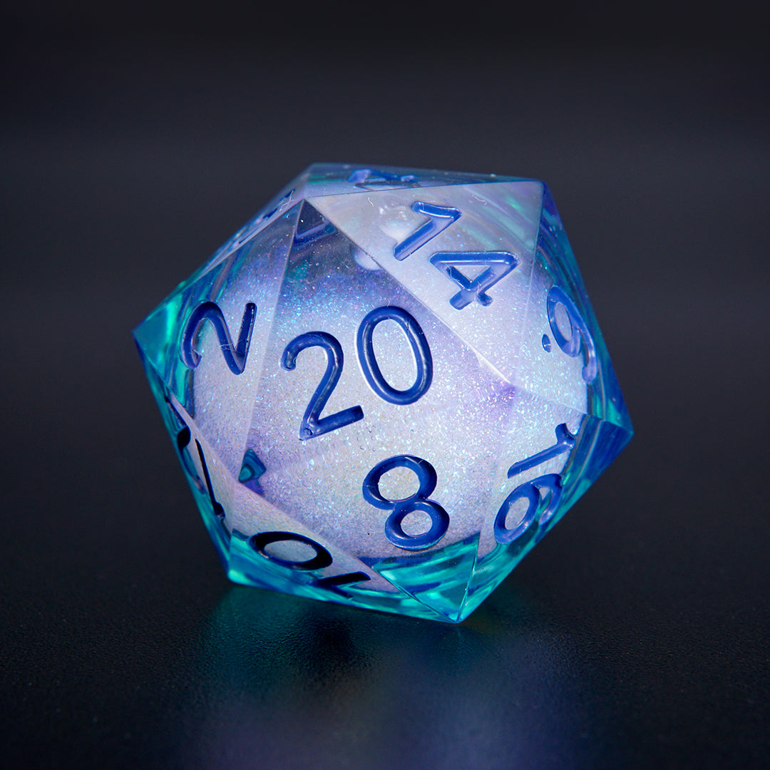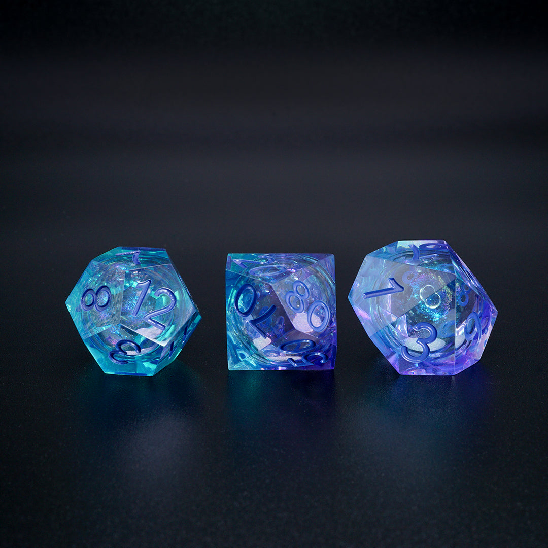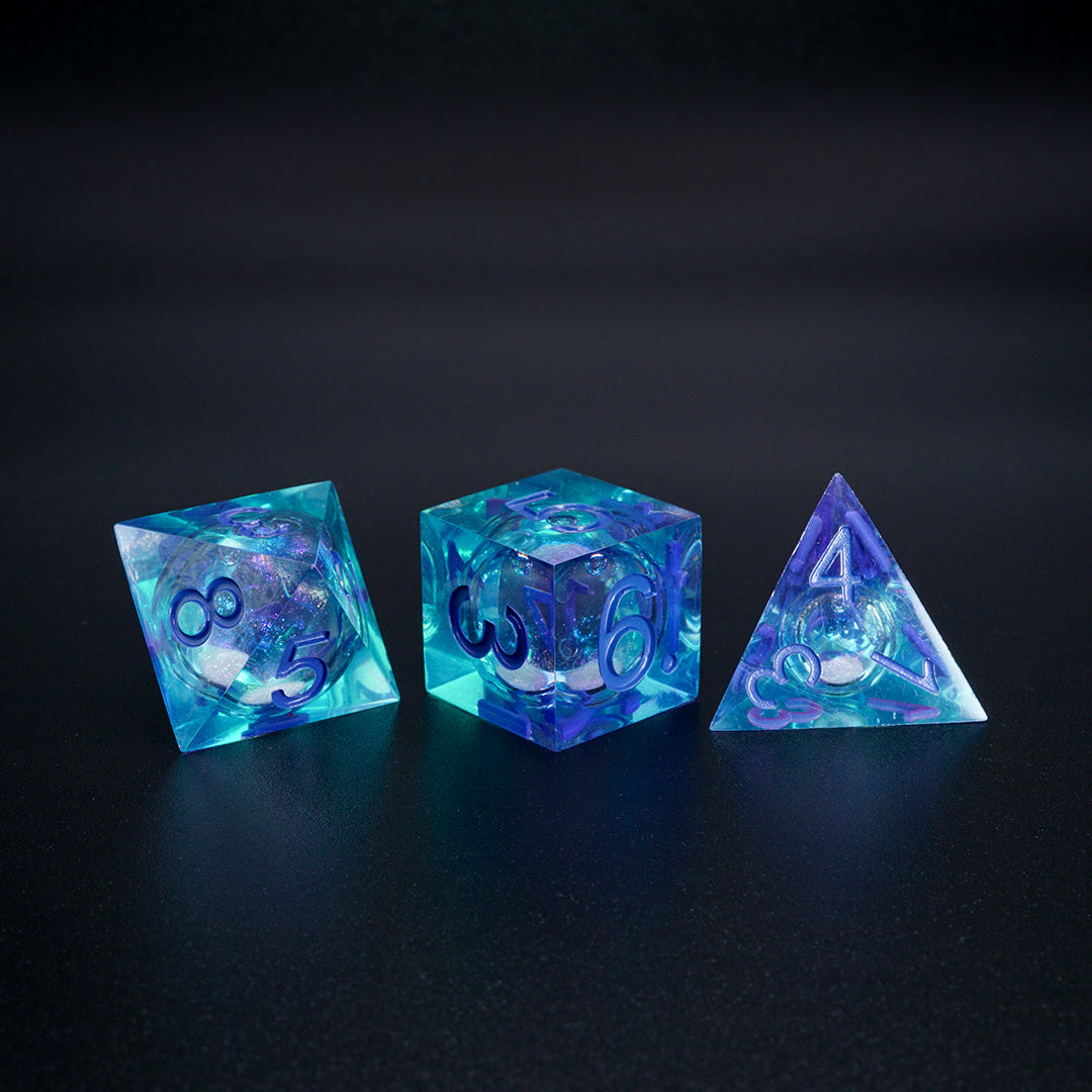 Handcrafted 7-piece resin sharp edge glitter liquid core dice set includes one of each of the following: d4, d6, d8, d10, d12, d20, d100 (%).