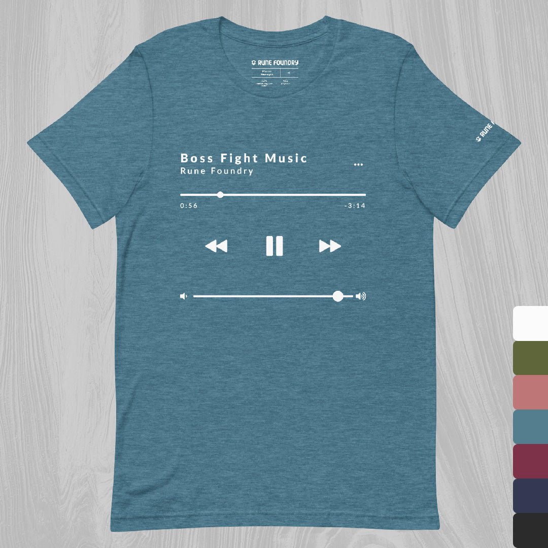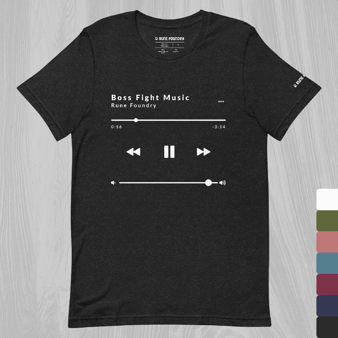 This gaming t-shirt reminds adventurers of epic battles fought using the inspiration of epic music. The hype builds in anticipation as soon as the boss fight music begins and doesn't let up until the last note is played, signifying the adventurer's victory!