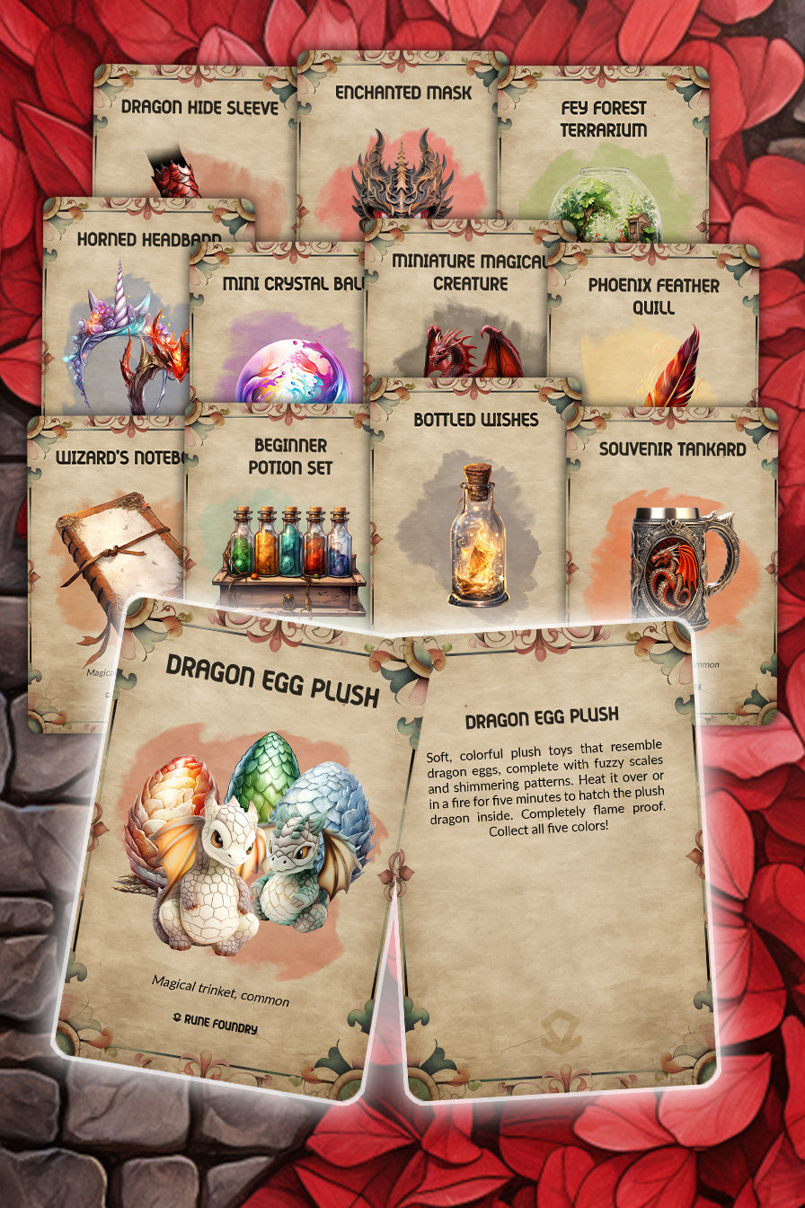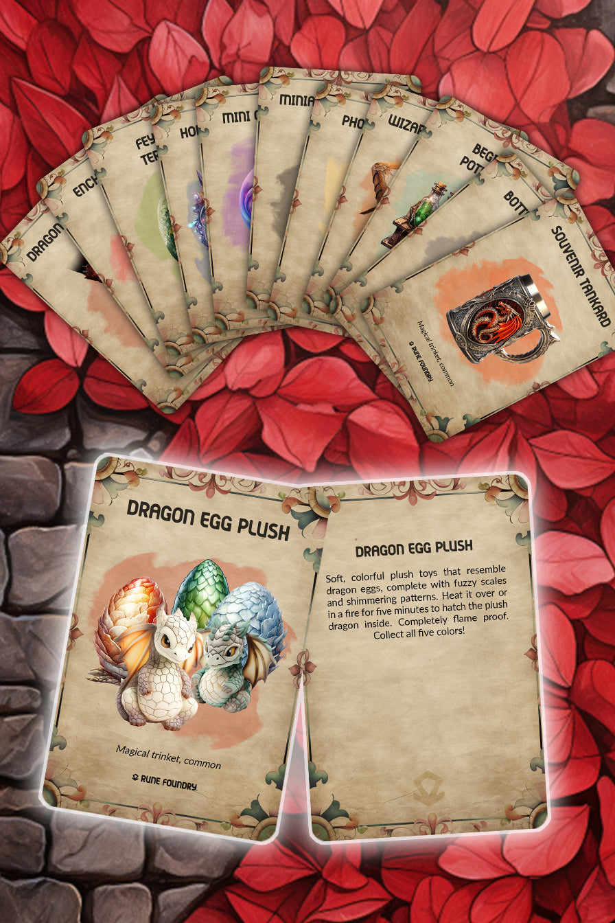 This item pack includes DnD 5e magic items in an easy to share card format. There are 12 in total. Included are digital files for each item, a printable card file, and a dungeon master cheat sheet to see all the item descriptions next to each other.