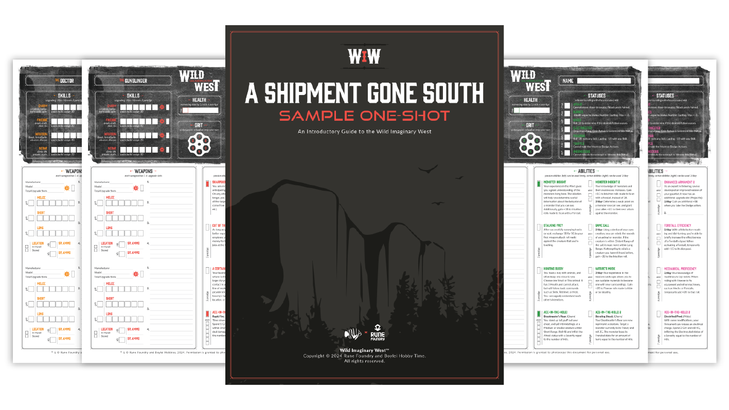 Take a peek and try out the Wild Imaginary West RPG using our Quickstart Guide! The Quickstart Guide includes four premade characters with sample Character Sheets and a sample one shot expedition: A Shipment Gone South.