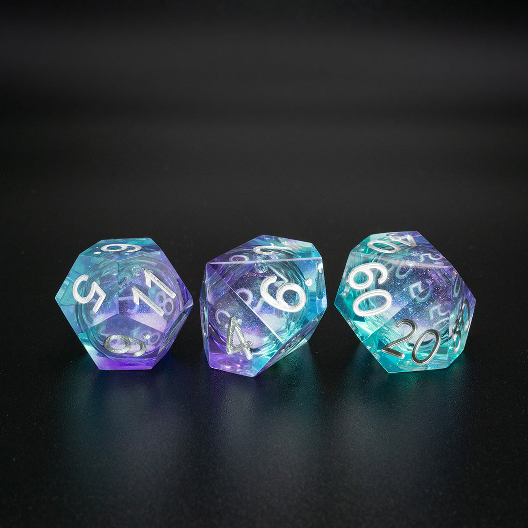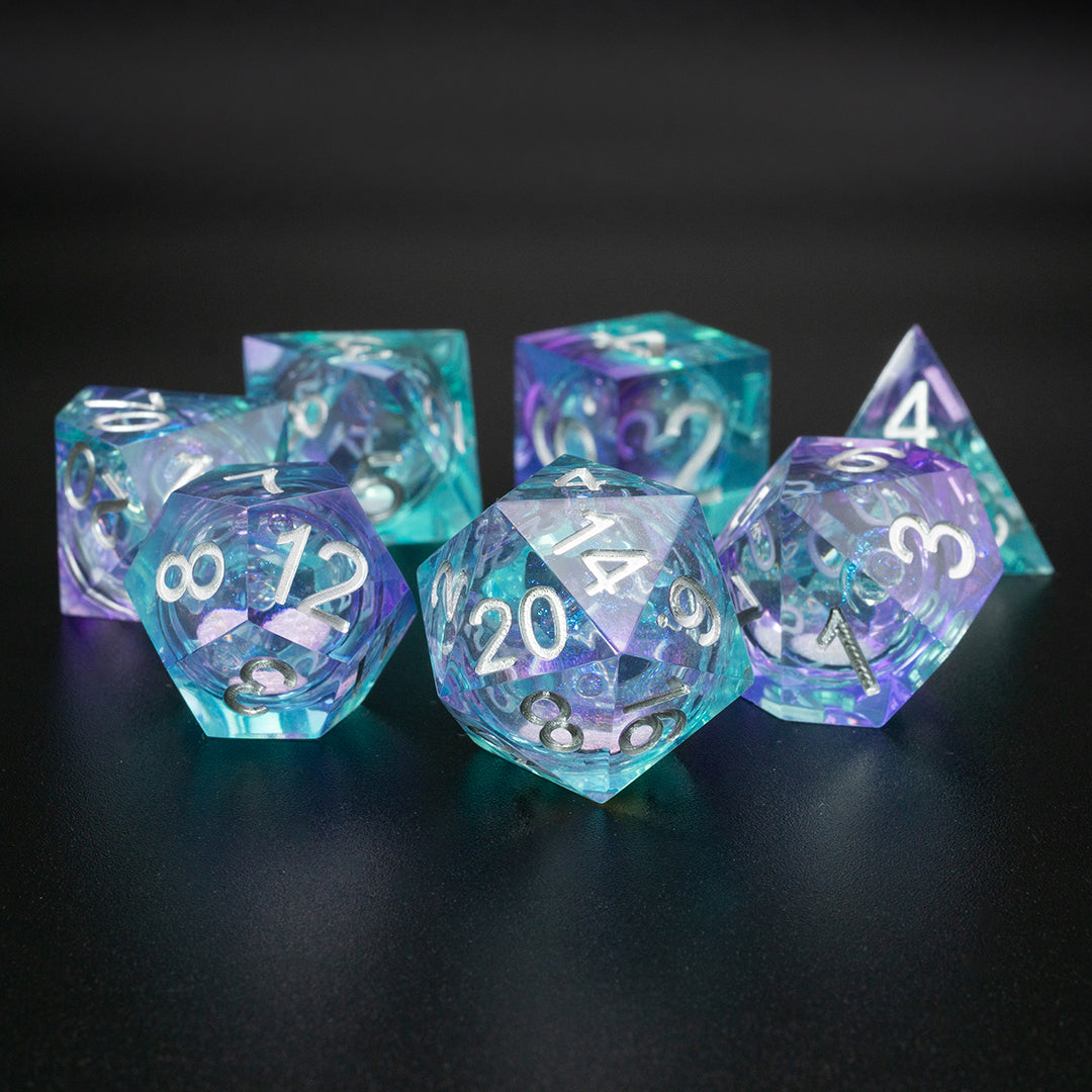 Handcrafted 7-piece resin sharp edge glitter liquid core dice set includes one of each of the following: d4, d6, d8, d10, d12, d20, d100 (%).