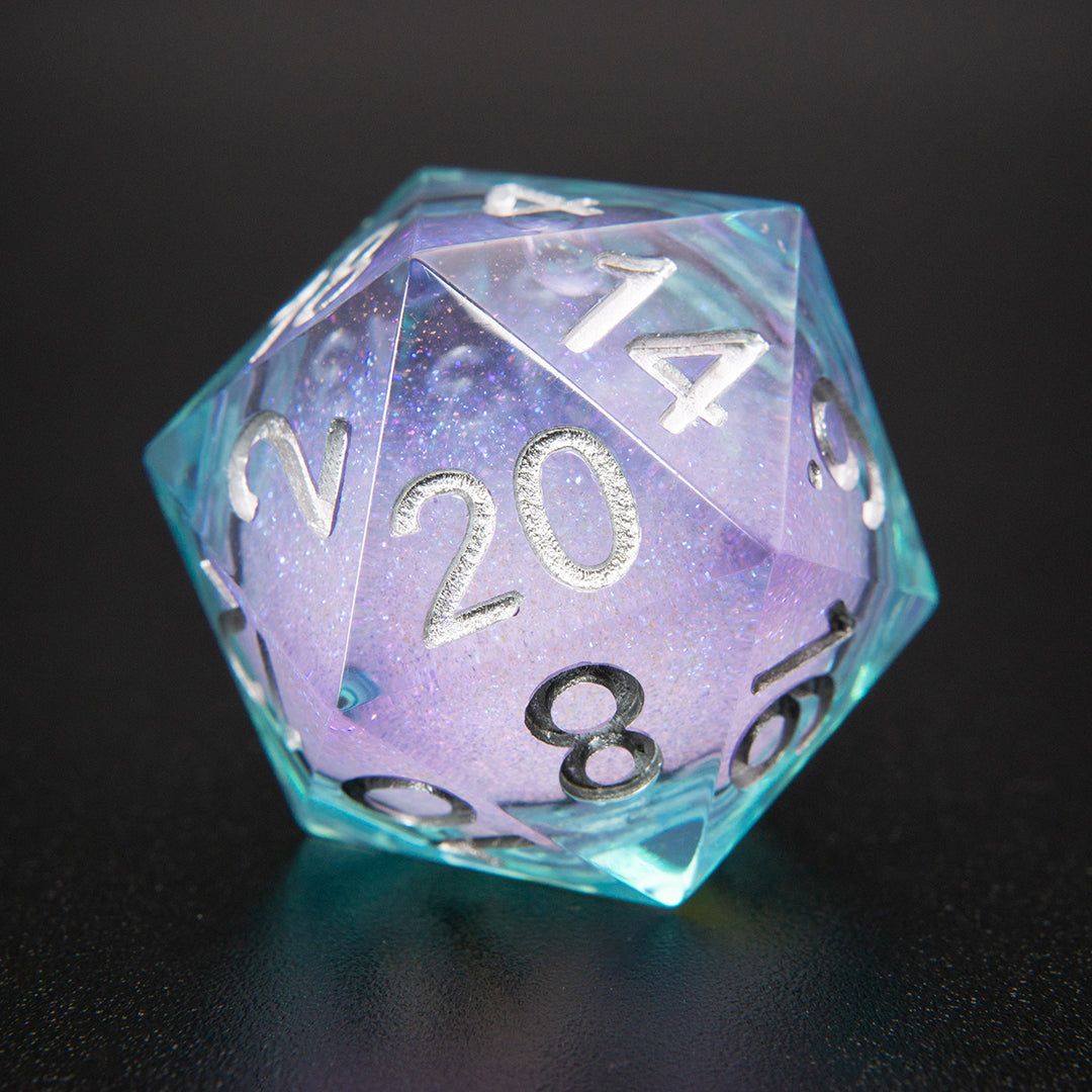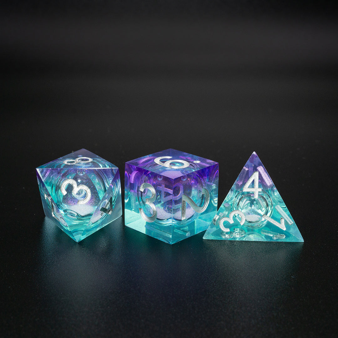 Turquoise and lavender with mica powder liquid core dice set. Numbers: silver.