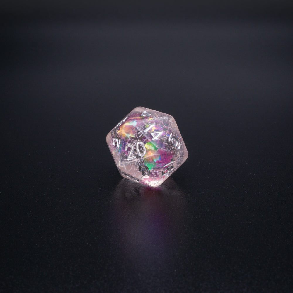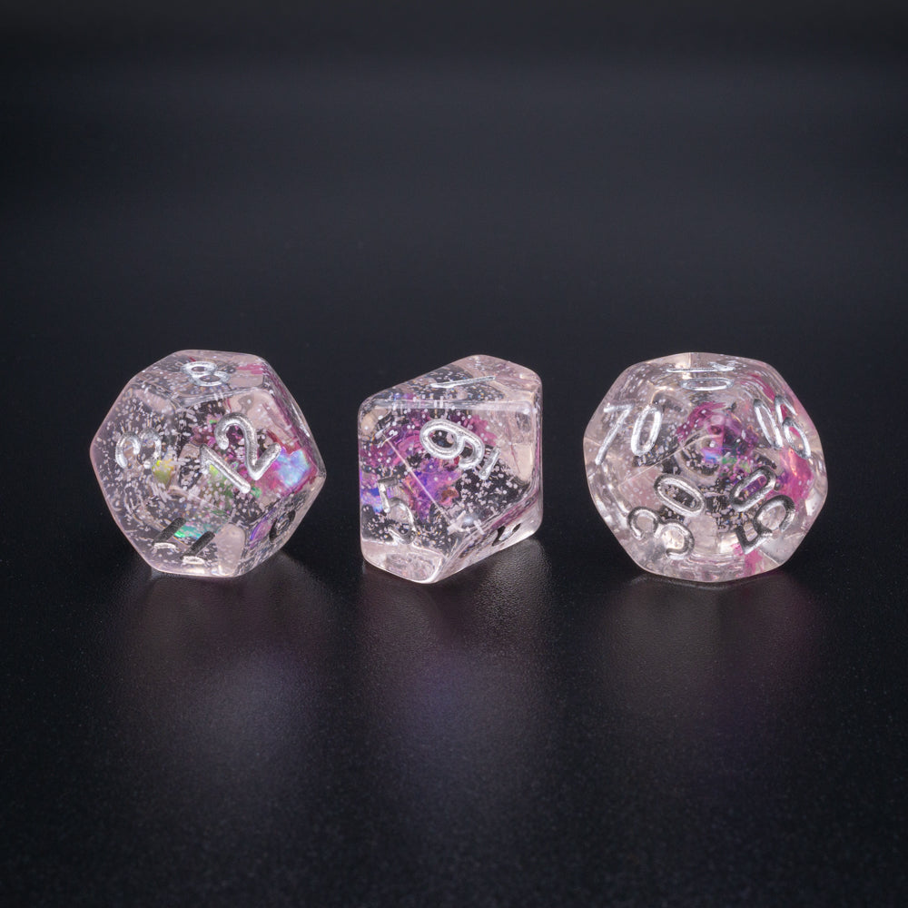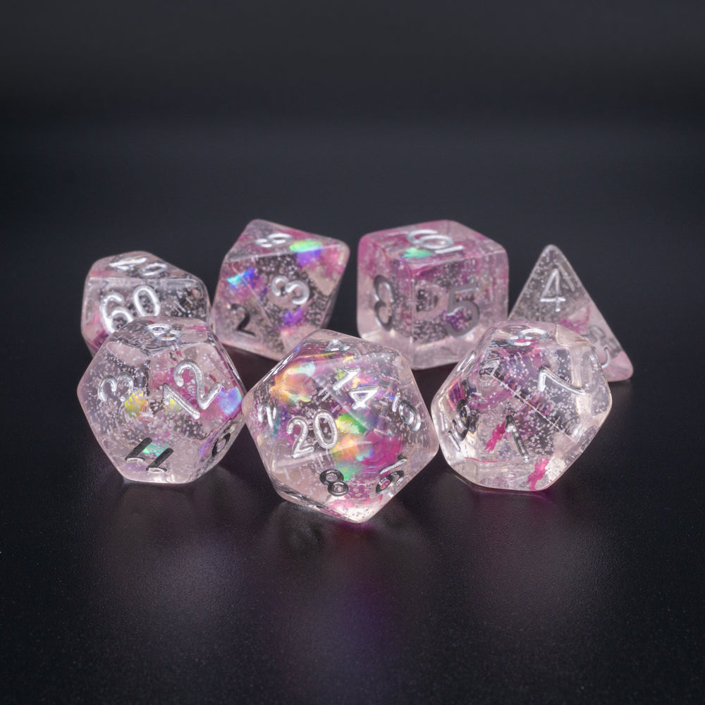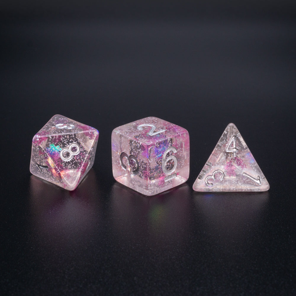 Semi-transparent RPG dice set with pink puffs and tiny white specks. Numbers: Silver.