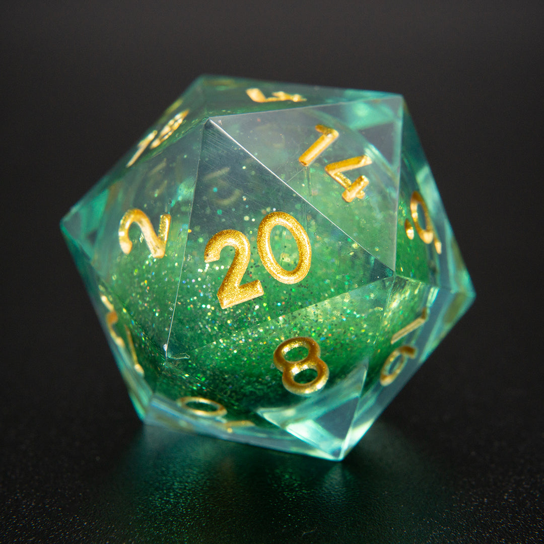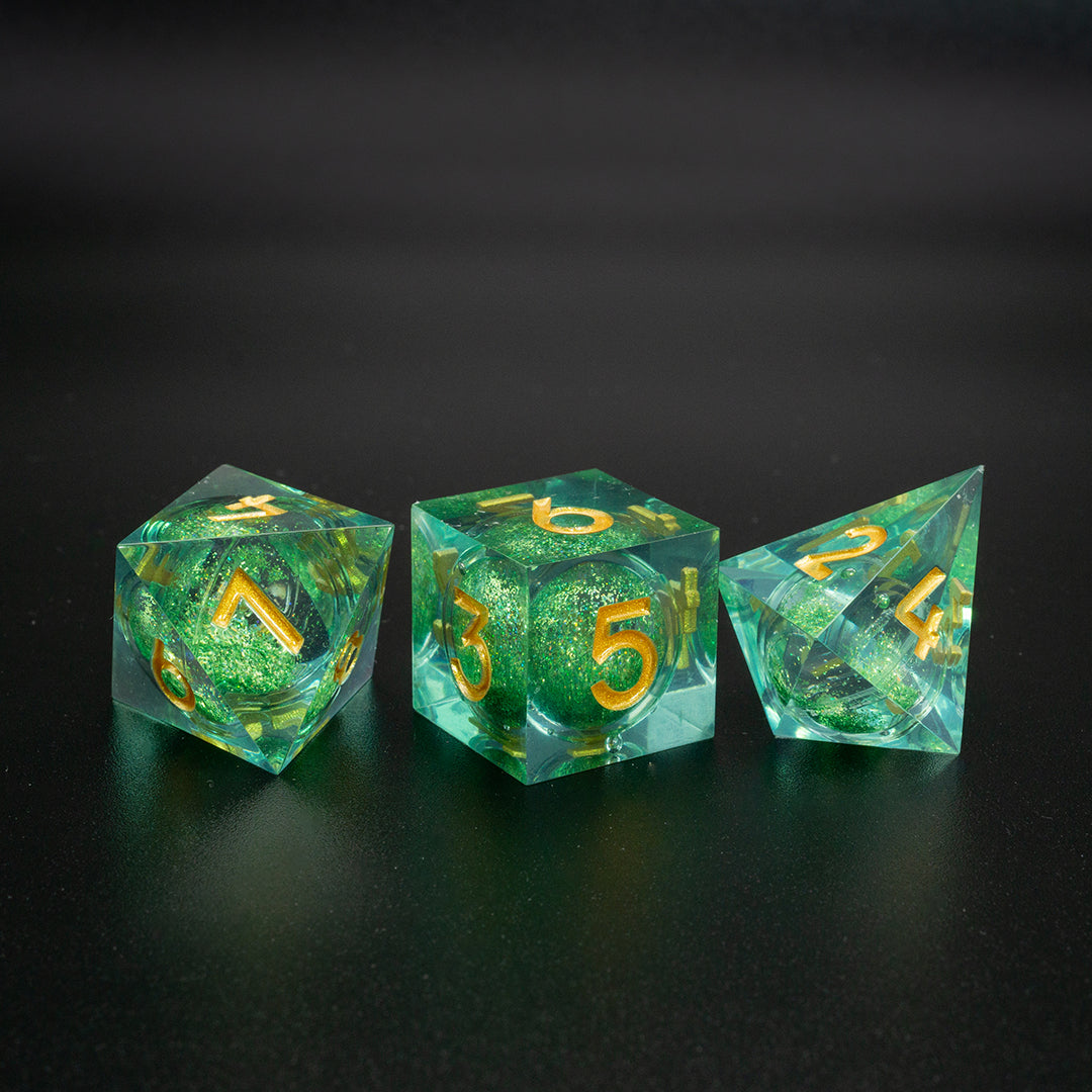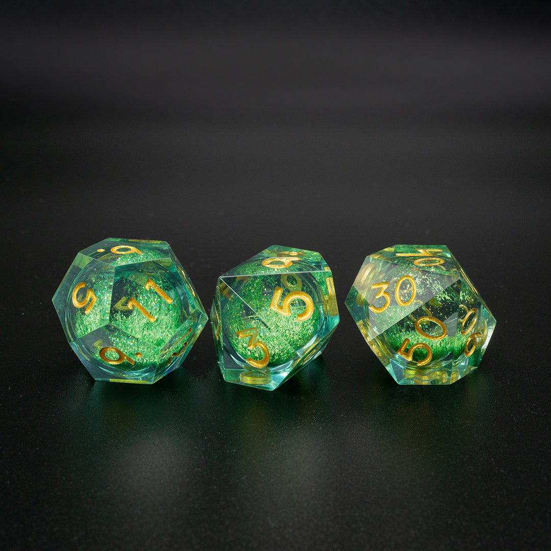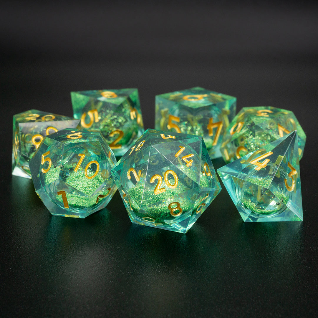 Handcrafted 7-piece resin sharp edge glitter liquid core dice set includes one of each of the following: d4, d6, d8, d10, d12, d20, d100 (%).