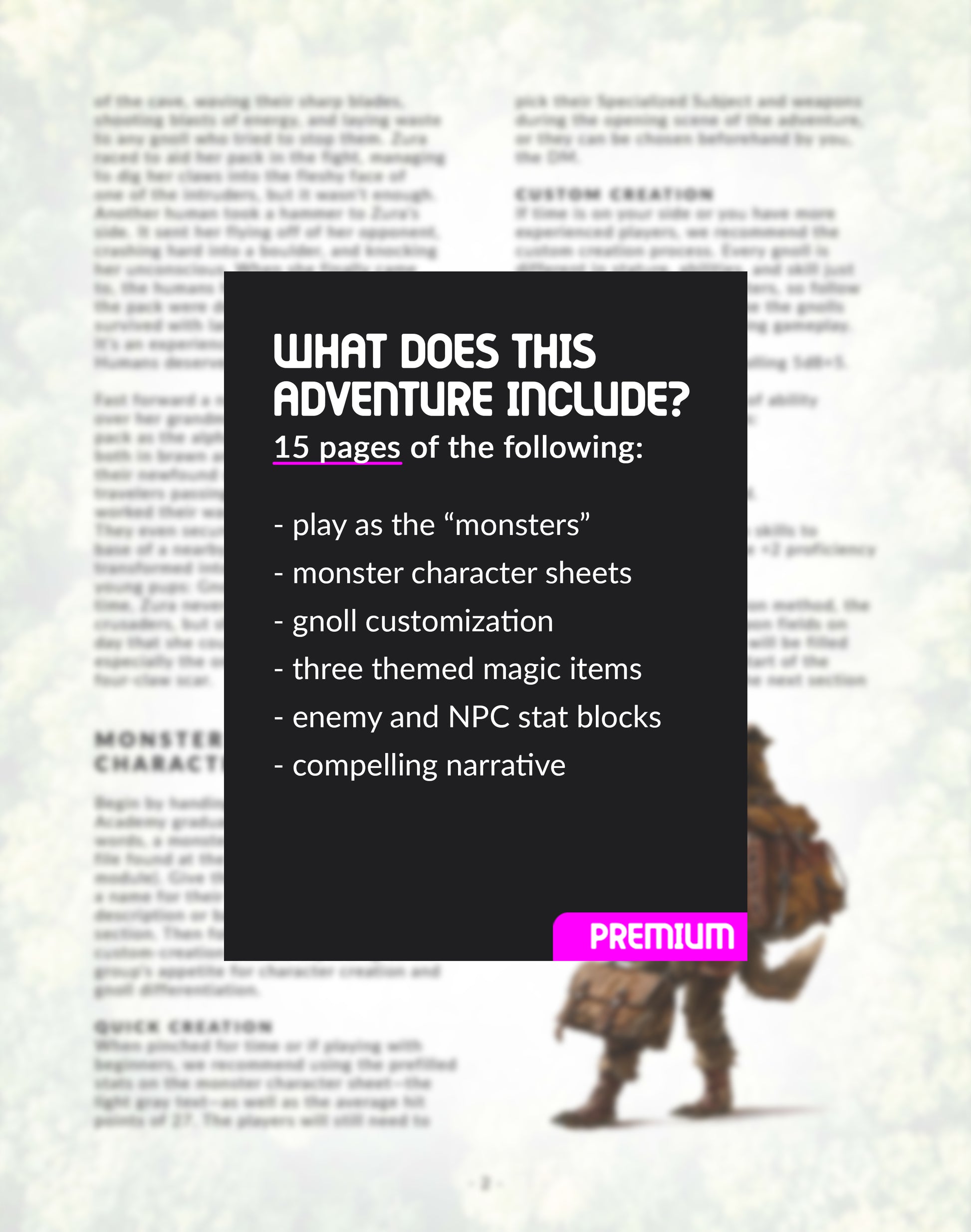 In this reversed-roles adventure, play as chaotic evil Gnolls just graduating from Gnoll Academy. Up to this point, they’ve been well-educated on the terrible impact humans have had on monster society from books, lectures, and homework, but are they ready to survive in the real world?