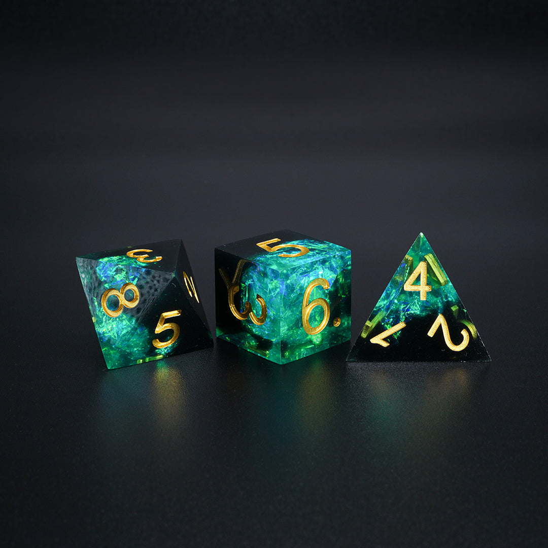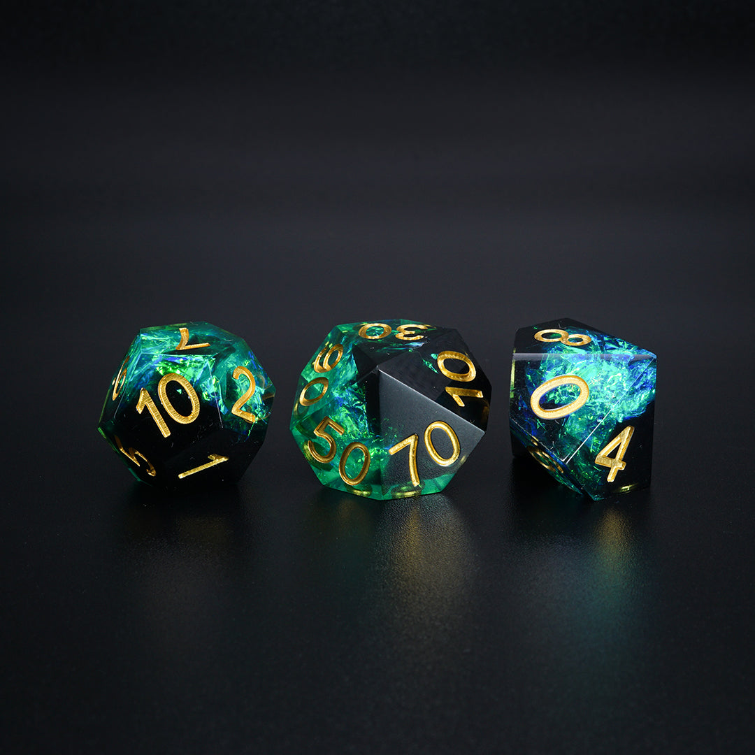 Greenish blue laser paper sharp edge dice set with gold numbers and a black floor on the lowest number.