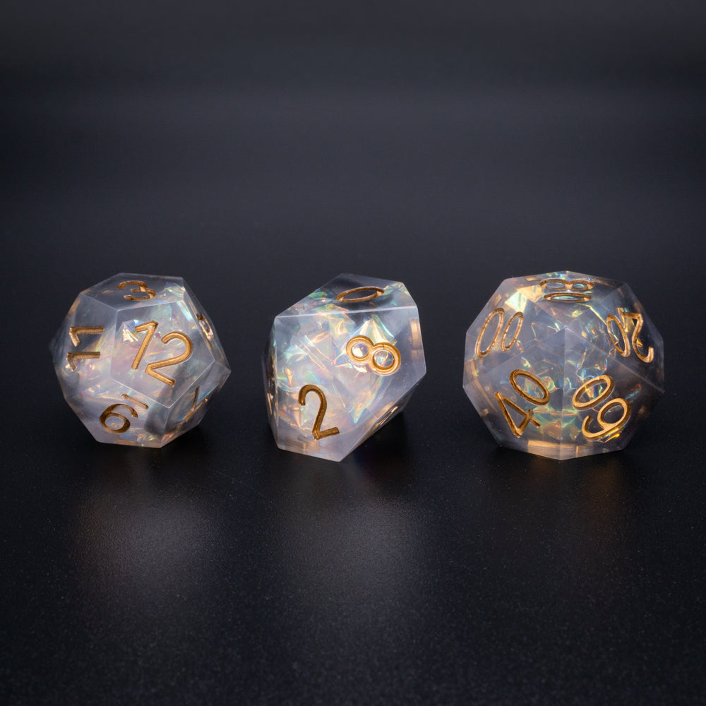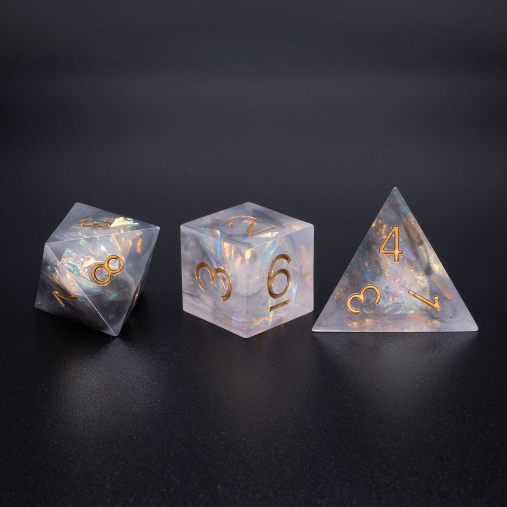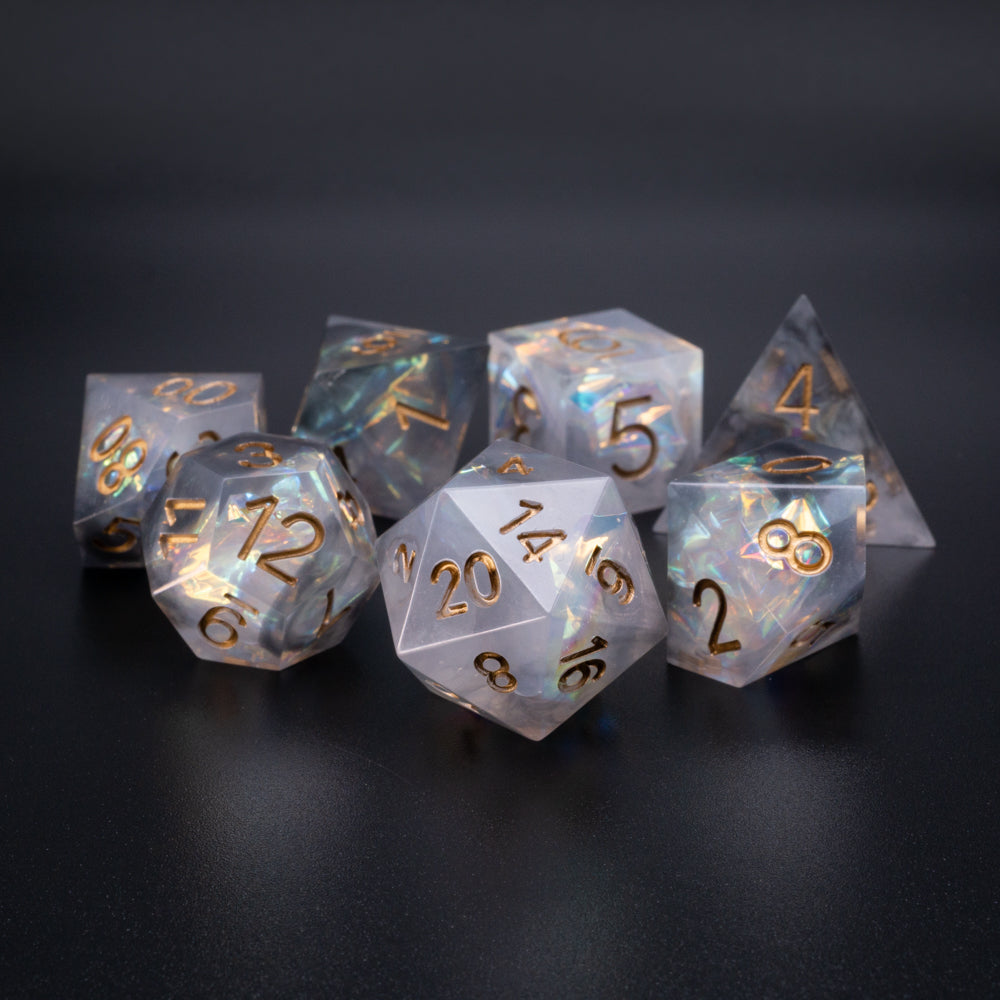 Handcrafted 7-piece sharp-edge dice set includes one of each of the following: d4, d6, d8, d10, d12, d20, d100 (%).