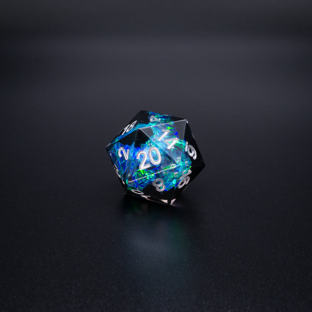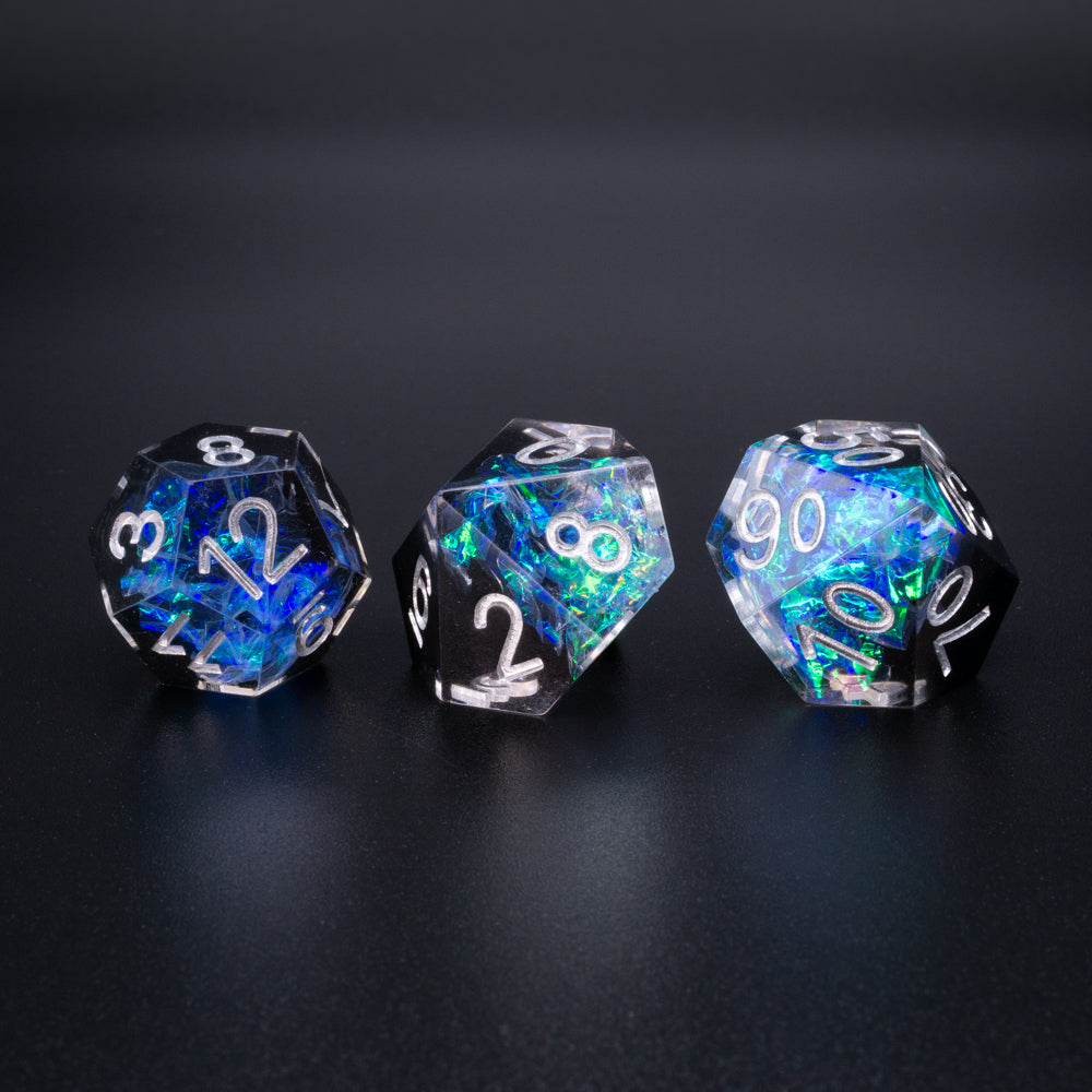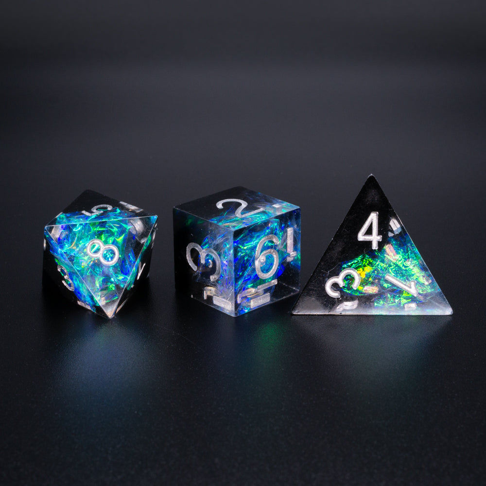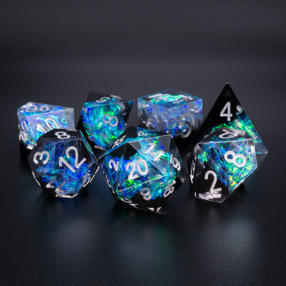 Handcrafted 7-piece sharp-edge dice set includes one of each of the following: d4, d6, d8, d10, d12, d20, d100 (%).