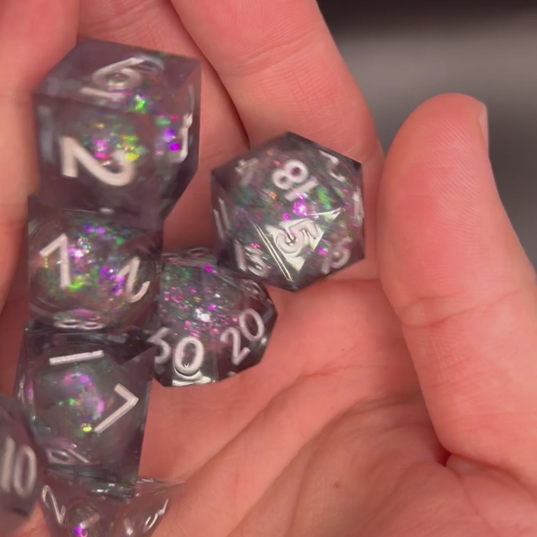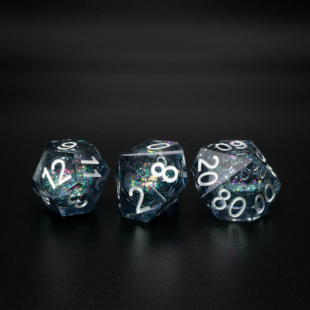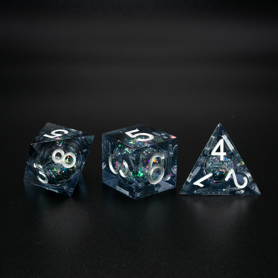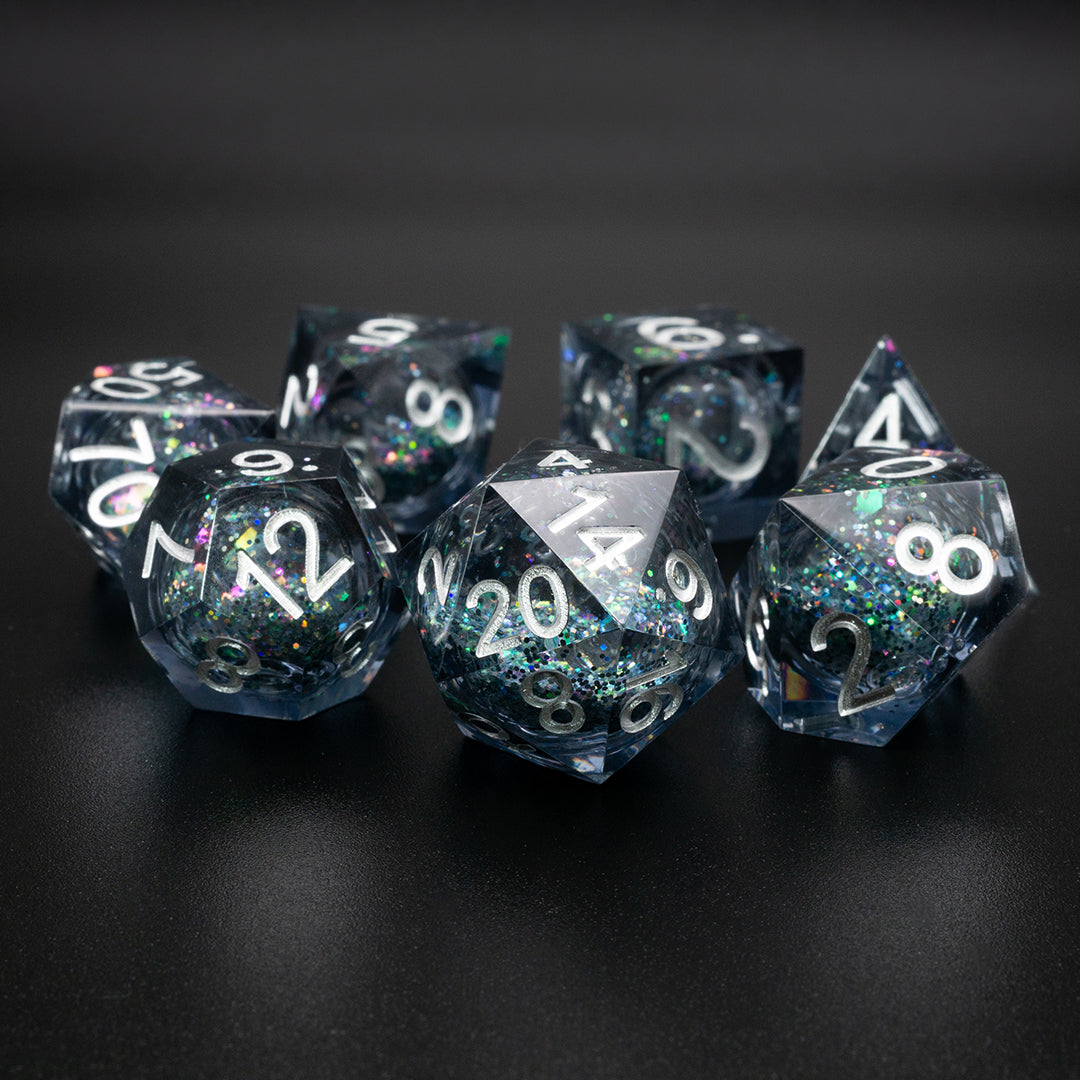 Handcrafted 7-piece resin sharp edge glitter liquid core dice set includes one of each of the following: d4, d6, d8, d10, d12, d20, d100 (%).
