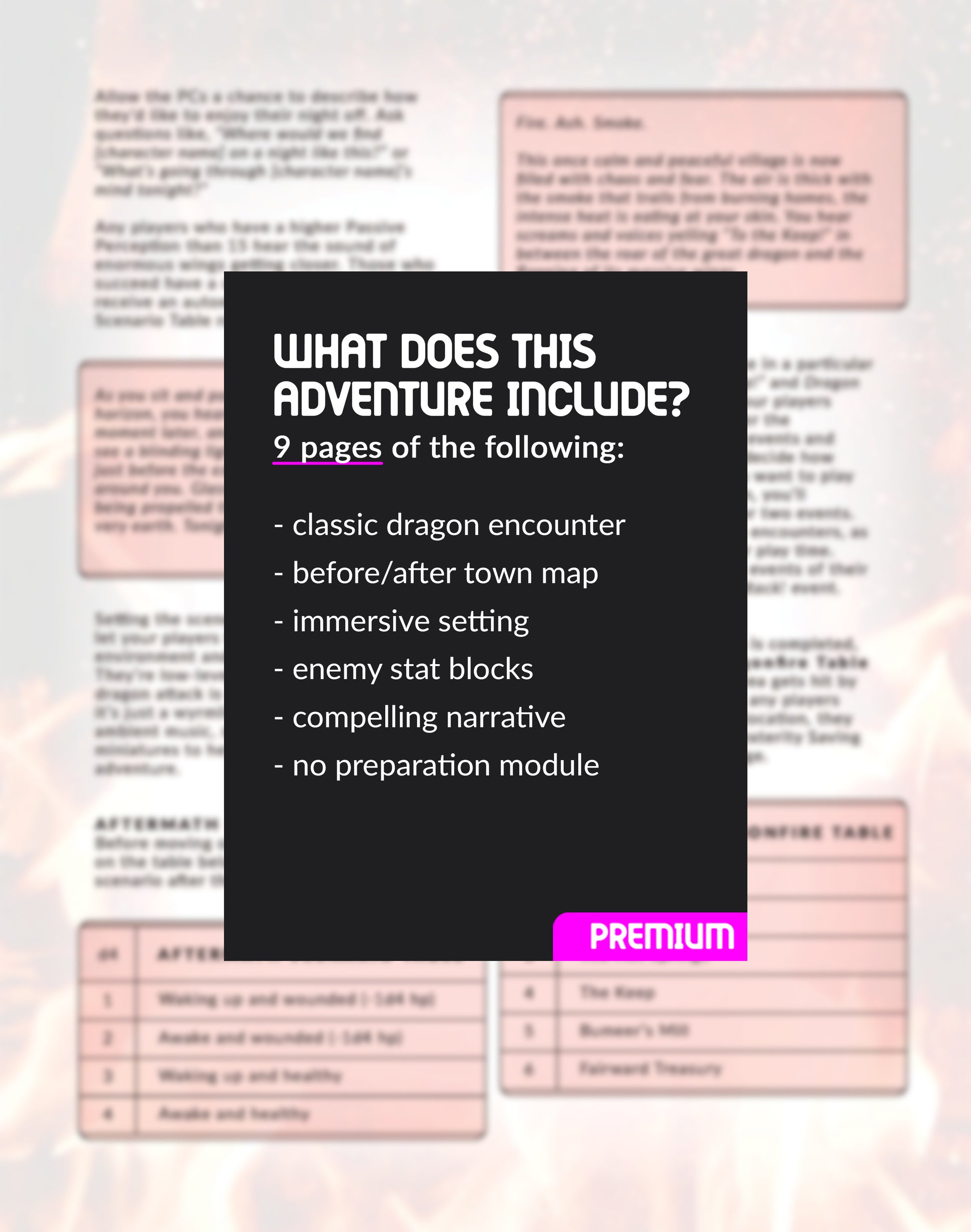 As written, this DnD adventure uses the stat block for a Red Dragon Wyrmling. If you wish to play this adventure with a higher average party level, consider using a Young Red Dragon’s stat block in its place.